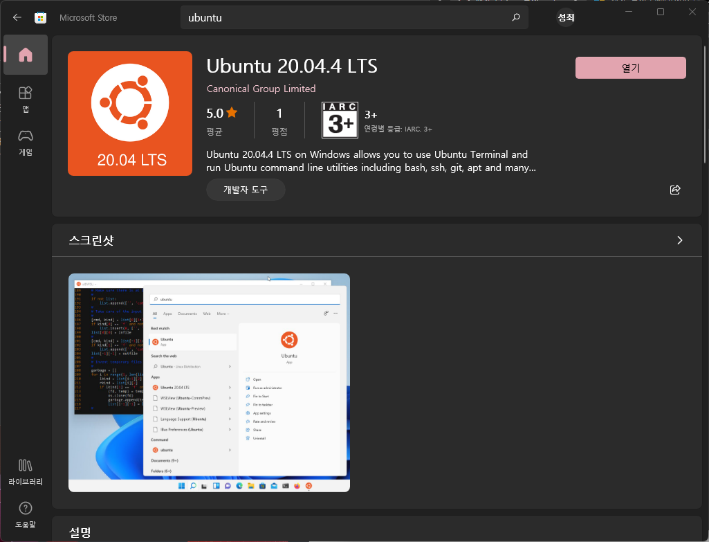 1. Microsoft Store에서 Unbuntu 20.04.LTS 버전을 찾아 설치한다.