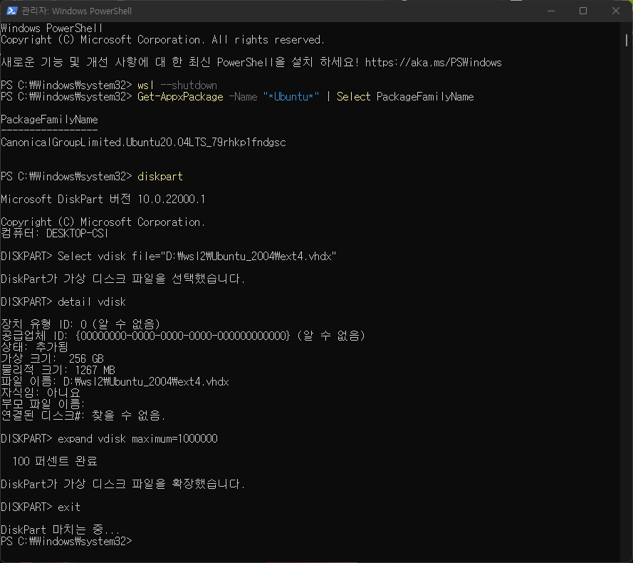 4. WSL2 VHD(Virtual Hard Disk)는 ext4 파일 시스템을 사용하고 초기 최대 크기는 256GB이다. 사용중 용량이 부족할 경우 다음 사이트를 참고하여 용량을 확장할 수 있다.