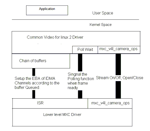 - IOCTL VIDIOC_STREAMON을 사용하여 스트림을 시작한다. 이 IOCTL은 i.MX Processing Engine 작업과 IDMA 채널을 활성화한다. 프레임에 대한 처리가 완료되면, 드라이버는 다음 프레임을 위해 대기중인(queued) 버퍼로 전환한다. 또한 드라이버는 버퍼가 준비 되었다는 신호를 세마포어로 보낸다.