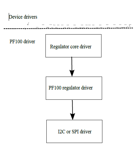 PF200/PF300은 동일한 PF100 드라이버를 공유하기 때문에 거의 변경없이 PF100을 기반으로 한다. PF100 레귤레이터 드라이버는 파워 서플라이 레귤레이터의 저수준 컨트롤, 전압 레벨 선택, 레귤레이터의 활성화/비활성화를 제공한다. 이 디바이스 드라이버는 PF100 레귤레이터 드라이버를 사용하여 PF100 하드웨어 컨트롤 레지스터에 액세스한다. PF100 레귤레이터 드라이버는 레귤레이터 core 드라이버를 기반으로 커널 I2C 버스에 부착된다.