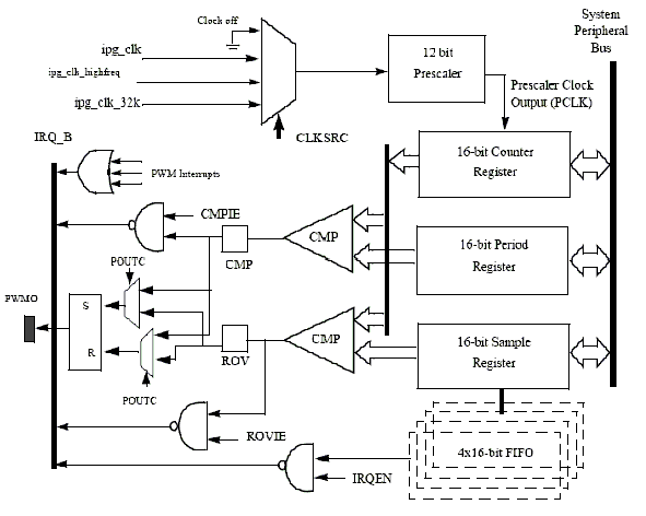 PWM은 프로세서 core와 인터페이스하기 위해 IP Bus 프로토콜을 따른다. CCM(Clock Control Module)의 clock, reset inputs과 프로세서 인터럽트 핸들러의 인터럽트 신호를 제외하고 디바이스 내부의 다른 모듈과 인터페이스 하지 않는다. PWM은 단일 외부 출력 신호인 PWMO가 포함된다. PWM은 다음과 같은 내부 신호가 포함된다 :