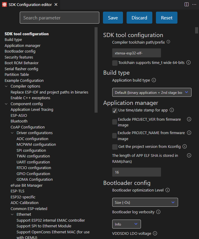 Cmake 구성 단계용 idf.cmakeCompilerArgs와 Nanja 단계용 idf.ninjaArgs에 대해 빌드 작업의 동작을 수정할 수 있다. 예로 [-j N]에서 N은 병렬로 실행되는 작업의 수이다. - "ESP-IDF: Size analysis of the binaries" 명령으로 애플리케이션 크기 정보를 검토할 수 있다.