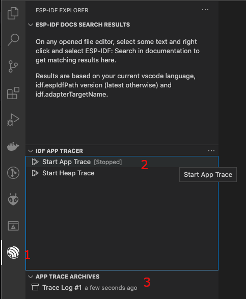 - 활동 표시줄에서 ESP-IDF Explorer를 클릭한다. IDF APP TRACER 섹션에서 "Start App Trace"을 클릭합니다. 그러면 확장의 openOCD 서버가 실행되고 해당 추적 명령을 보내 추적 로그를 생성한다. Trace Log #1로 명명된 APP TRACE ARCHIVES에서 생성된 추적 로그를 볼 수 있다. "Start App Trace"을 실행할 때마다 새로운 추적이 생성되어 아카이브 목록에 표시된다. ESP-IDF: App Trace 명령을 실행하여 추적을 시작할 수도 있다.