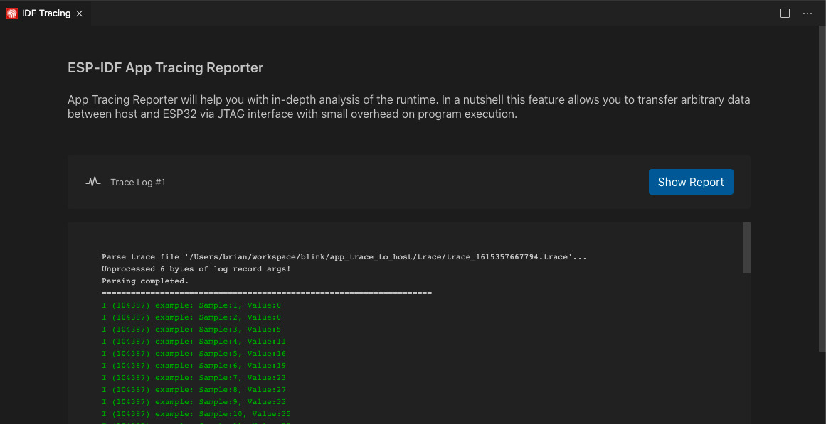 이 예에서, 프로젝트는 이미 애플리케이션 추적을 목적으로 구성되었다. 다른 프로젝트에서는 ESP-IDF: SDK Configuration editor 명령으로 CONFIG_APPTRACE_DEST_TRAX 및 CONFIG_APPTRACE_ENABLE을 활성화해야 한다.