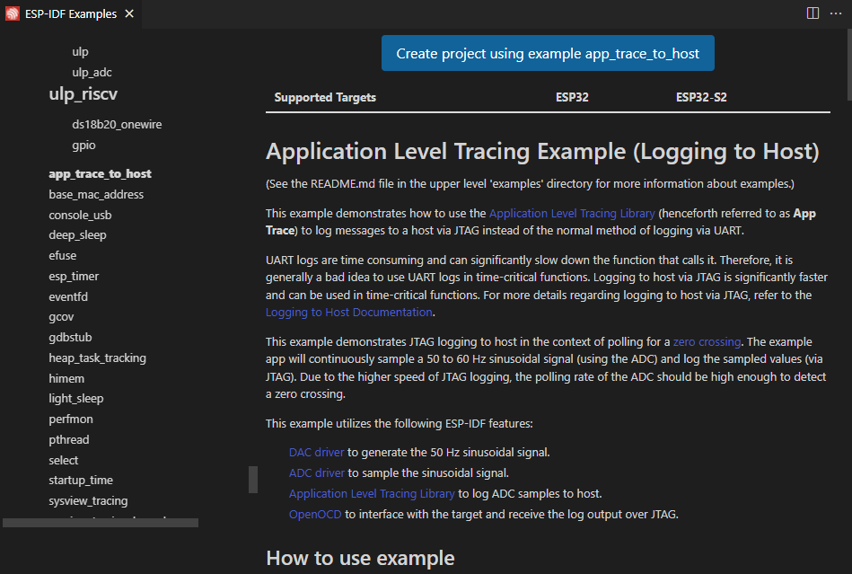 ESP-IDF 프로젝트를 연다. 이 자습서에서는 system/app_trace_to_host 예제를 사용한다.