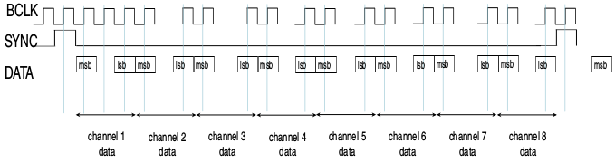 믹서 블록에는 2개의 오디오 스트림을 위한 2개의 시리얼 오디오 입력 인터페이스가 있다. 그 중 하나는 일반적인 오디오용으로 사용되고 다른 하나는 safety tone(안전한 음정)용 이다. 시리얼 오디오 TDM 프레임은 각각 32비트의 8개 샘플을 포함할 수 있다. 처음 6개 샘플은 3개의 스테레오 DAC 용이다. 각 DAC는 왼쪽과 오른쪽 채널에 대해 구 개의 샘플을 사용한다. 마지막 2개의 샘플은 특수한 용도이고 향후 사용을 위해 유지된다. 오디오 믹싱 애플리케이션에서 두 개의 오디오 입력 스트림은 동일한 수의 채널과 프레임 속도를 가져야 한다. 프레임 형식은 아래 그림과 같다.