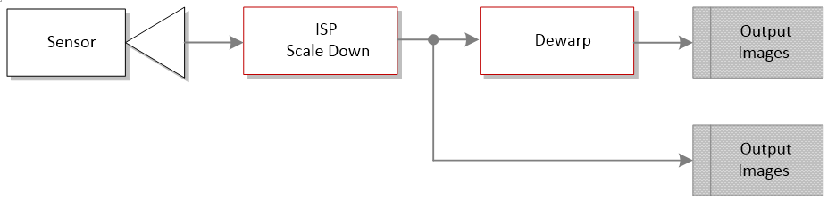 이미지의 출력 흐름은 위에 있는 그림과 같다. Dewarp 출력을 사용하면, ISP Scale Down 이후의 데이터를 Dewarp 모듈의 입력으로 사용한다. 따라서 Dewarp 보정 파라미터는 Dewarp 입력 이미지의 크기에 따라 보정되어야 한다. 해당하는 해상도의 보정 파라미터가 없는 경우, 시스템은 기존 보정 파라미터에 따라 현재 해상도의 보정 파라미터를 조정한다. 이 경우 변환된 보정 데이터는 원래의 보정 데이터만큼 정확하지 않다. 따라서 사용되는 모든 해상도를 보정하고 보정 데이터의 결과를 Dewarp 구성 파일에 추가하는 것이 좋다.