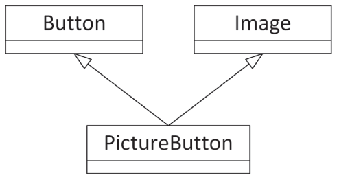 사용자 인터페이스 컨텍스트에서 사용자가 클릭할 수 있는 이미지를 상상해 본다. 이 클래스는 버튼과 이미지 둘 다인 것 같으므로, 구현은 Figure 5-11과 같이 Image 클래스와 Button 클래스 모두 상속에 포함할 수 있다.