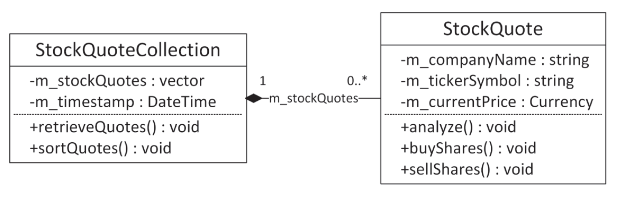 컴포넌트 간의 관계를 보여주는 다이어그램을 만드는 것이 종종 유용하다. Figure 5-1은 UML 클래스 다이어그램 구문(Appendix D)을 사용하여 StockQuoteCollection에 0개 이상(0..*)의 StockQuote 개체가 포함되어 있고, StockQuote 개체는 단일(1) StockQuoteCollection에 속함을 나타낸다.