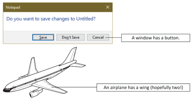 종종 사용자 인터페이스 시나리오에 대해 생각하는 것이 클래스 관계를 이해하는 데 도움이 된다. 모든 UI가 OOP로 구현되는 것은 아니지만(요즘은 대부분 그렇지만), 화면의 시각적 요소가 클래스로 잘 변환되기 때문이다. has-a 관계에 대한 한 가지 UI 비유는 버튼이 포함하는 윈도우이다. 버튼과 윈도우는 분명히 별개의 두 클래스이지만, 어떤 면에서는 분명히 관련되어 있다. 버튼이 윈도우 안에 있기 때문에 윈도우에 버튼이 있다고 말한다.
