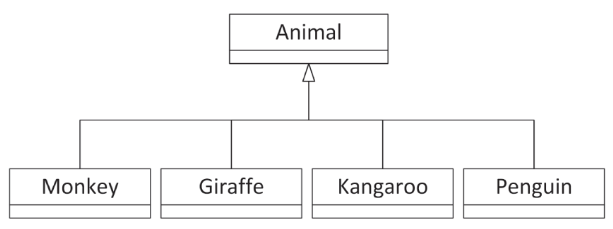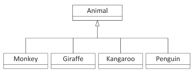 이것이 프로그래머에게 의미하는 바는 모든 동물과 관련된 모든 속성(크기, 위치, 식단 등)과 동작(이동, 먹기, 수면)을 캡술화하는 Animal 클래스를 정의할 수 있다는 것이다. 동물의 모든 특성을 원숭이가 포함하고 있기 때문에, 원숭이와 같은 특정 동물은 Animal의 파생 클래스가 된다. 기억할 것은, 원숭이는 동물에 더해 그것과 구별하게 만드는 몇 가지 추가적인 특성들이 있다. Figure 5-4는 동물에 대한 상속 다이어그램을 보여준다.