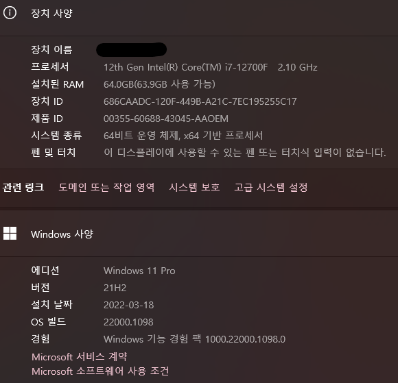 사용한 호스트 PC 사양은 위의 이미지와 같다. 주의해야 할 부분은 윈도우 버전과 메모리 용량이다.