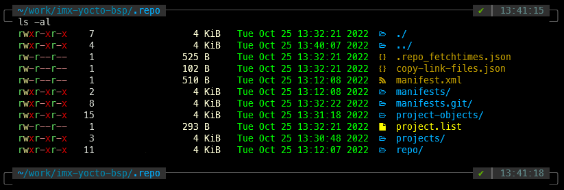 아래 이미지에서 다음 오드할 manifest 파일로 "imx-5.15.52-2.1.0.xml" 파일을 지정하고 있다. - manifests/ : manifest 프로젝트의 git 체크아웃(브랜치 이동). ".git/(manifests/의 하위 폴더)" 상태는 manifest.git bare 체크아웃을 지정(링크되어 있음)한다. --manifest-branch를 통해 repo init 시간에 지정된 git 브랜치를 추적한다.