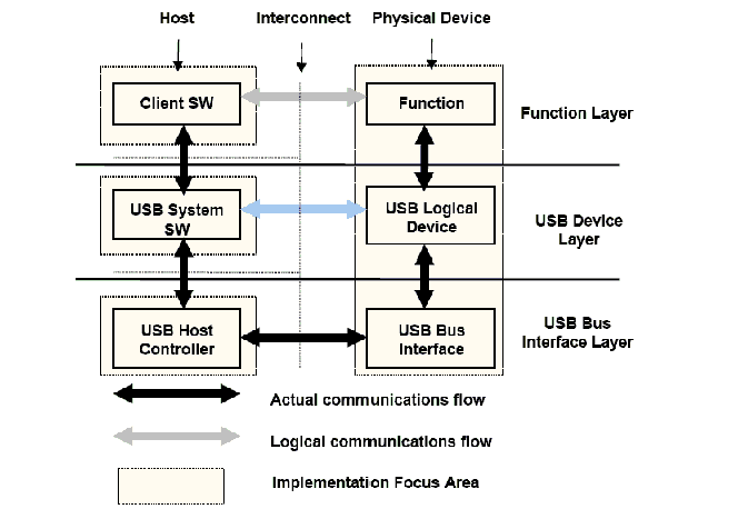 아래 그림은 USB 2.0을 지원하는 호스트 시스템의 빌딩 블록 레이어에 대한 개념적인 블록 다이어그램을 보여준다.