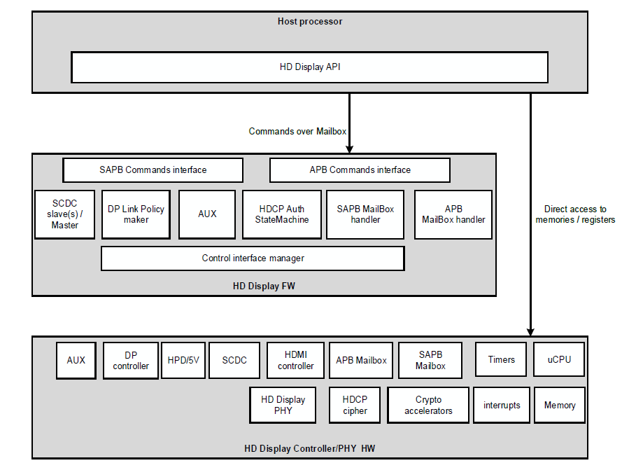 호스트 프로세서는 APB 인터페이스로 HD Display 컨트롤러와 인터페이스한다. 호스트 프로세서는 다음 방법 중 하나 이상으로 HD Display Controller를 관리한다: