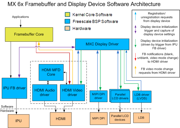 i.MX 6Dual/6Quad/6QuadPlus/6Solo/6DualLite는 IPU 모듈에 연결되어 구동되는 다양한 유형의 디스플레이 출력 디바이스(예: LVDS, LCD, HDMI 및 MIPI 디스플레이)를 지원한다. MXC Display Driver API는 디스플레이 디바이스를 등록하고 각 IPU DI에 연결하는 방법을 구성하는 시스템을 제공한다. HDMI 드라이버는 IPU에서 올바른 비디오 입력을 받기 위해 이 API를 사용하여 자신을 디스플레이 디바이스로 등록한다.