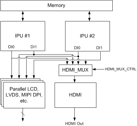 HDMI에 대한 비디오 입력은 구성 가능하고 i.MX 6 시리즈의 두 IPU 모듈 중 하나와 IPU, DI0 또는 DI1의 두 Display Interface(DI) 포트 중 하나에서 올 수 있다. 이 구성은 HDMI_MUX_CTRL 레지스터 필드를 사용하는 IOMUX 모듈을 통해 컨트롤된다. 이 상호 연결에 대한 설명은 아래 그림을 참조한다.
