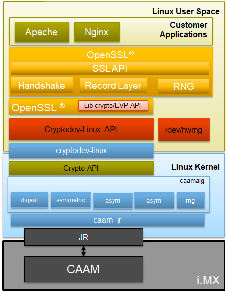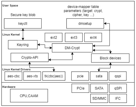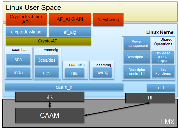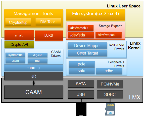 Linux 커널에는 NXP CAAM 보안 하드웨어 블럭용 Scatterlist Crypto API 드라이버가 포함되어 있다. 모든 디스크 암호화와 키 관리 제품군이 하드웨어를 자동으로 사용하여 암호화 가속을 수행하는 방식으로 DM-Crypt, Keyctl과 같은 커널 내 암호화 사용자와 원활하게 통합된다. CAAM 하드웨어는 Linux 커널에서 내부 블럭 이름인 Cryptographic Accelerator and Assurance Module을 따서 'caam'으로 알려져 있다.