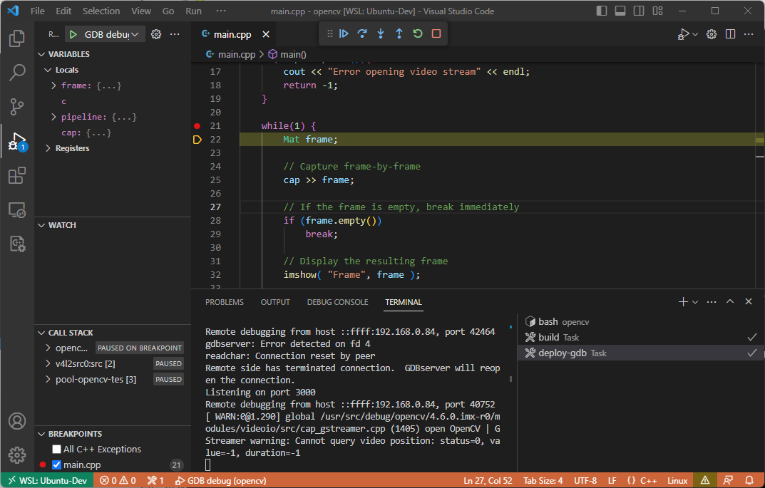 VSCode는 디버그 모드로 전환하고 대상 디바이스에서 gdbserver를 실행하는 gnome-terminal을 실행한다.