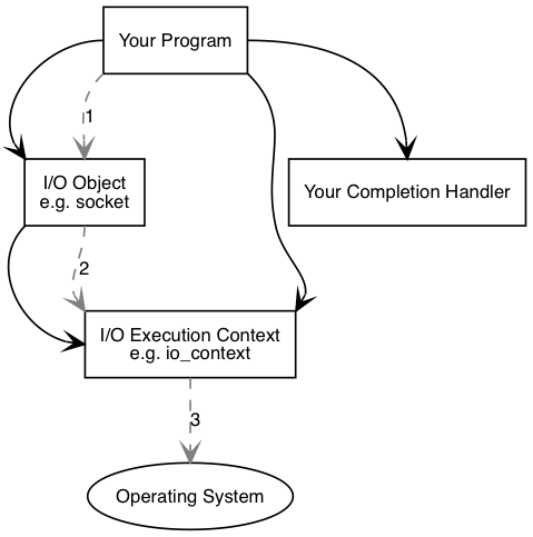 프로그램에는 boost::asio::io_context 개체, boost::asio::thread_pool 개체 또는 boost::asio::system_context와 같은 I/O 실행 컨텍스트가 적어도 하나 있다. 이런 I/O 실행 컨텍스트는 운영 체제의 I/O 서비스에 대한 프로그램의 링크를 나타낸다.